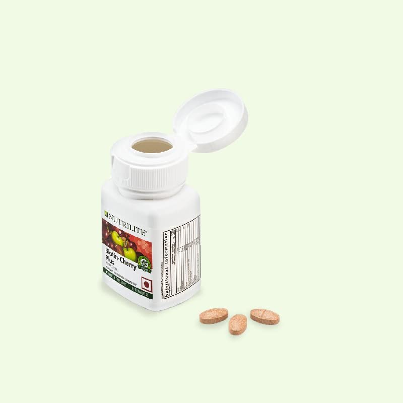 Nutrilite Biotin - Cherry Plus helps support hair, skin, and nails. Biotin helps maintain healthy skin and nails. Nutrilite Biotin - Cherry Plus is a nutritional supplement with ingredients that support the healthy growth of nails, hair, and skin by providing structure and reducing brittleness.