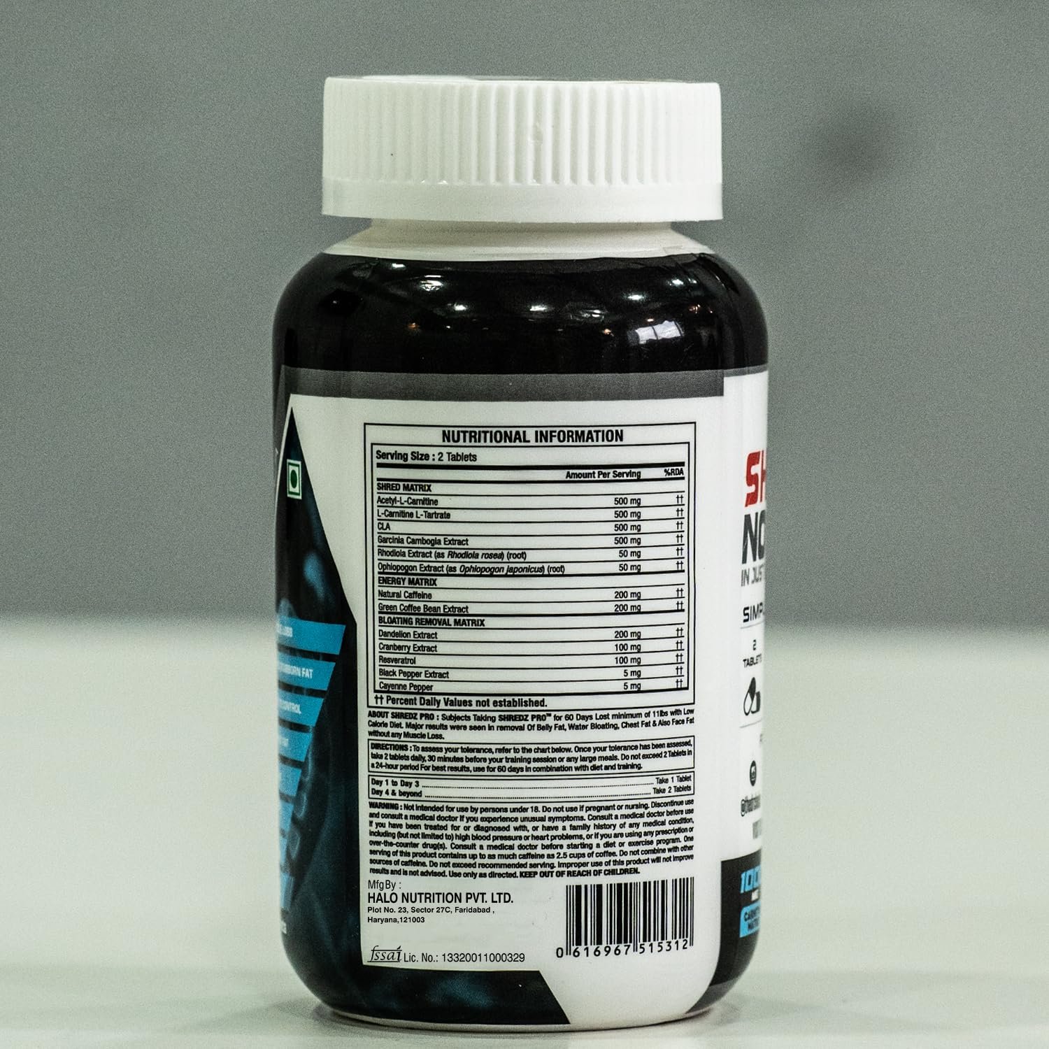 Shredz Pro Contains 13 powerful & natural ingredients. Specially Designed combination of 500mg Acetyl-L-Carnitine , 500 mg L-carnitine L-tartrate , 500mg CLA, 500mg Garcinia Cambogia.; The advanced formula is locked inside the tablet. It is recommended to consume 2 tablets 30 minutes prior to the exercise. Avoid Junk Foods for better result.