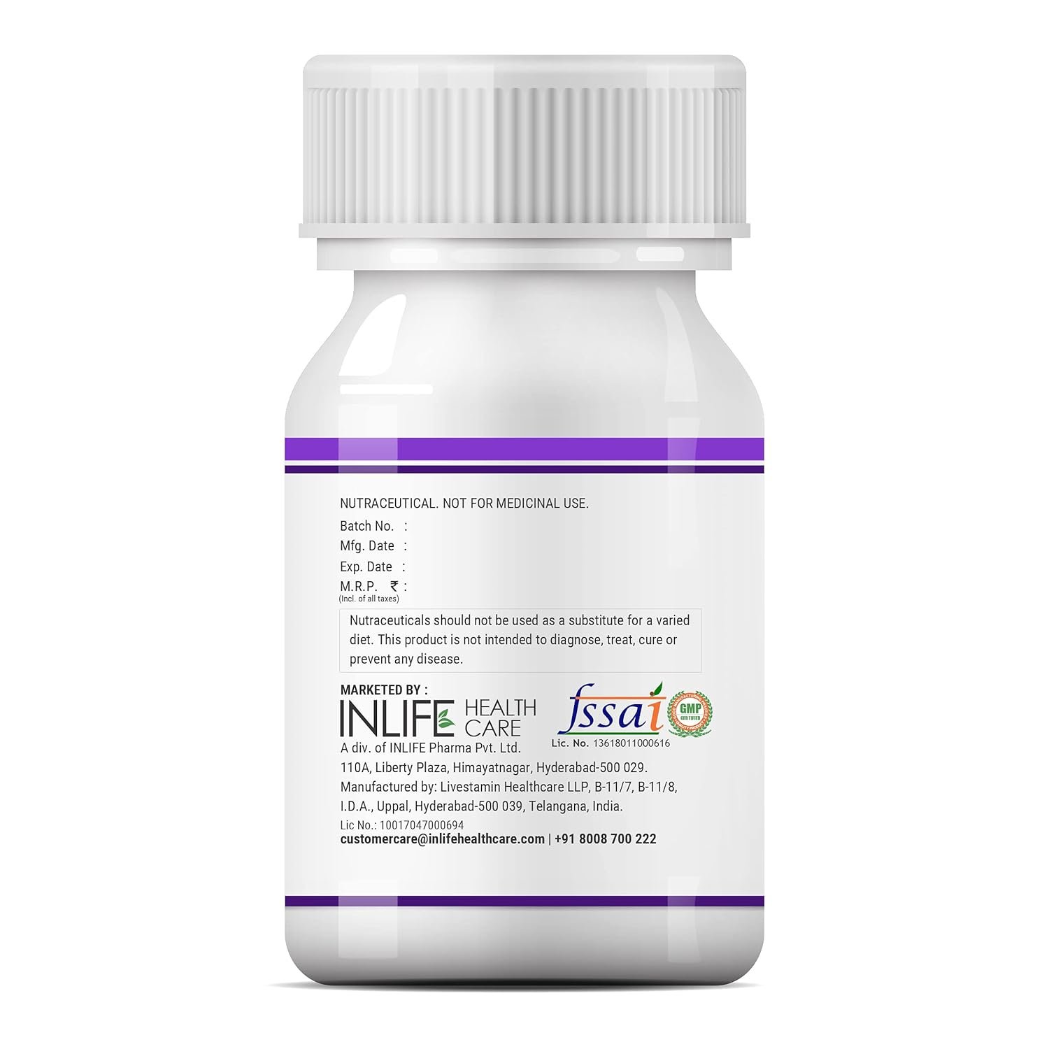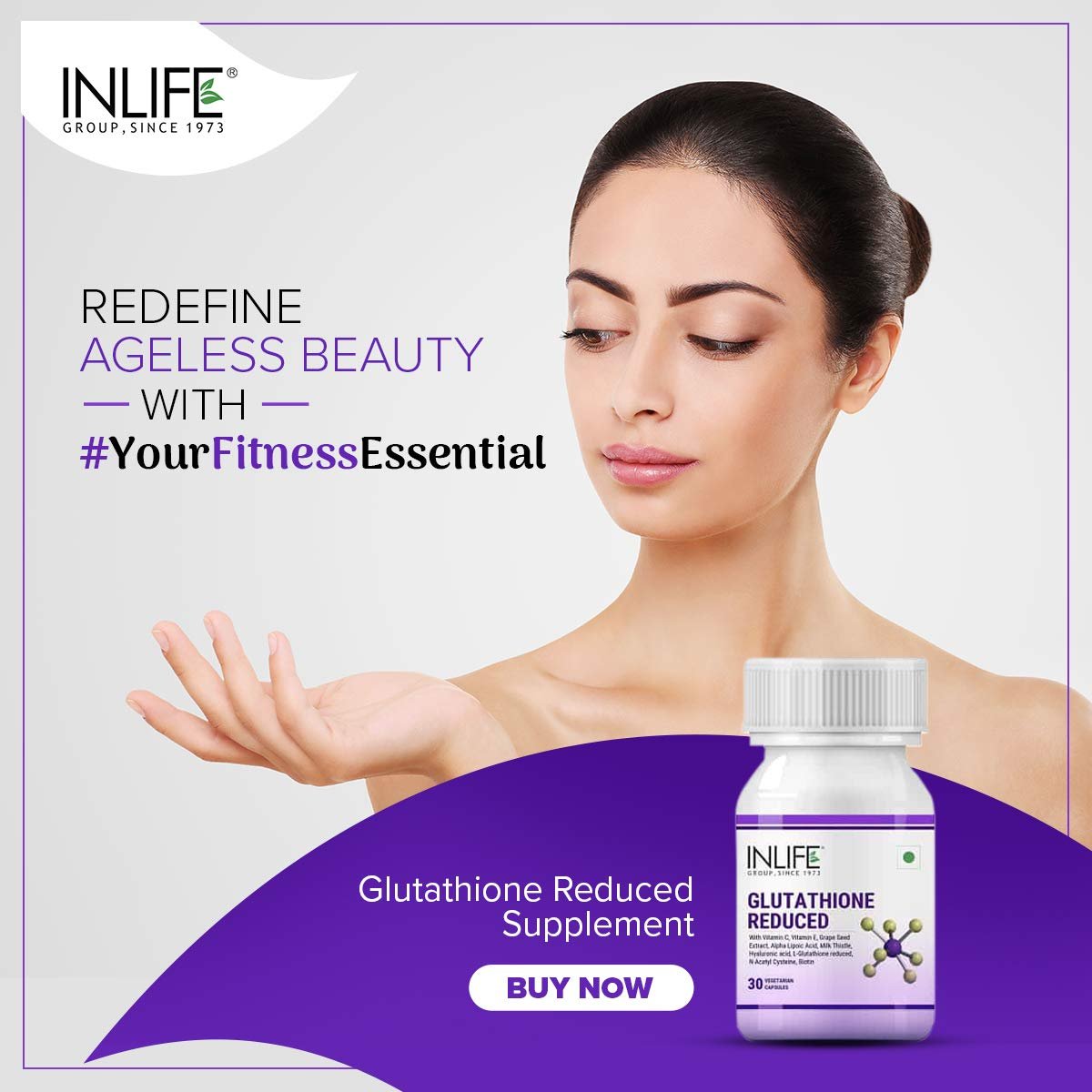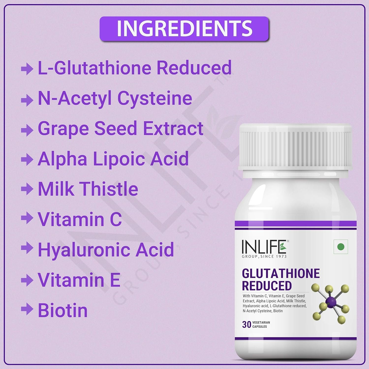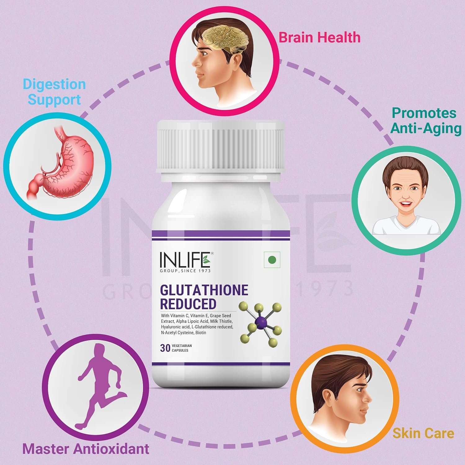 STRENGTH: INLIFE's Glutathione supplement contains 500mg of reduced Glutathione per capsule. It is a unique and effective combination of Glutathione with N-Acetyl Cysteine, Grape Seed Extract, Alpha Lipoic Acid, Milk Thistle, Vitamin C, Hyaluronic Acid, Vitamin E and Biotin that supports better health. This herbal complex is rich in nutrients and antioxidants that. You get 30 vegetarian capsules per bottle. MASTER ANTIOXIDANT: Glutathione is an important water-soluble antioxidant that plays an important role in reducing oxidative stress caused by free radicals. Many experts call reduced glutathione the mother of all antioxidants, since it supports the function of other antioxidants in the body. This antioxidant can regenerate other antioxidants, such as vitamin C and E thus returning them to their active form. SKIN CARE: L-Glutathione reduced capsules supports healthy skin & nails. It is widely known for maintaining healthy skin. INLIFE is one amongst the best brand for quality L Glutathione Reduced Supplements in India. BETTER IMMUNITY: Glutathione supports the function of your body's major detoxification pathways. It helps eliminate toxins that the body has already absorbed. Glutathione helps fortify your immune system. This may help reduce internal toxicity and improve multiple cellular processes. Use our capsules to support healthy levels of this important molecule. PURITY: Glutathione complex by INLIFE is produced in Vegan and vegetarian-friendly capsules. Our product contains the most effective formulation of trusted ingredients that are carefully processed and manufactured in a GMP certified manufacturing facility so you can be sure that you're safe.