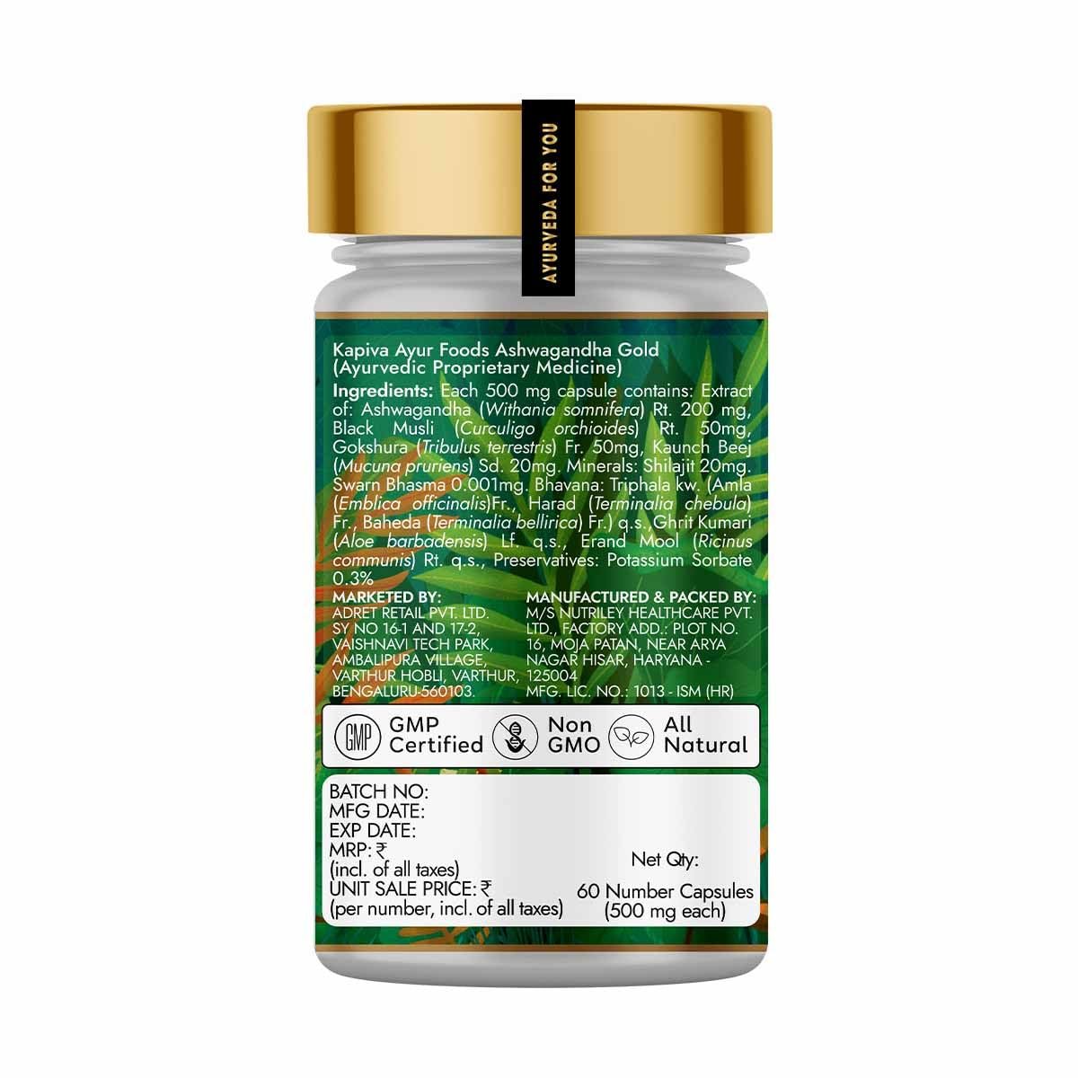 M/s Nutriley Healthcare Pvt. Ltd., M/s Nutriley Healthcare Pvt. Ltd., Factory Add.: Plot no. 16, Moja Patan, Near Arya Nagar Hisar, Haryana - 125004 MFG. LIC. NO.: 1013 - ISM (HR)Adret Retail Pvt. Ltd. (Kapiva) 1 Gupta Lane, Kolkata -700006, West Bengal, India.