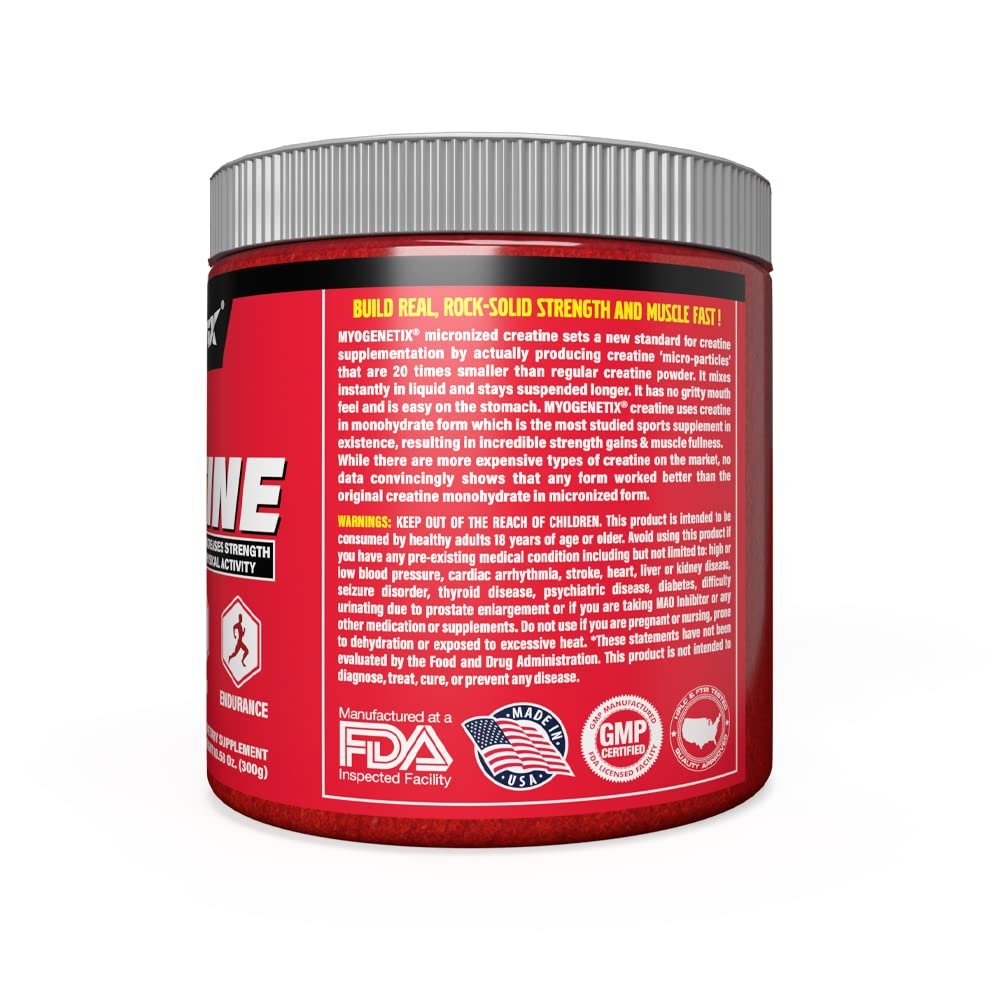 MYOGENETIX micronized creatine sets a new standard for creatine supplementation by actually producing creatine ‘micro-particles’ that are 20 times smaller than regular creatine powder. It mixes instantly in liquid and stays suspended longer. It has no gritty mouth feel and is easy on the stomach. MYOGENETIX creatine uses creatine in monohydrate form which is the most studied sports supplement in existence, resulting in incredible strength gains & muscle fullness. While there are more expensive types of creatine on the market, no data convincingly shows that any form worked better than the original creatine monohydrate in micronized form. DIRECTIONS FOR USE: As a dietary supplement, for the first 3 days (loading phase): Mix 1 scoop with 8 oz. of water and consume 4 times daily. After day 3 (maintenance phase): Mix 1 scoop with 8 oz. of water 1 to 2 times daily. For more impressive results, replace water with a carbohydrate beverage or sports drink. TIPS: Drink at least 8 glasses of water daily when supplementing with creatine. Consuming simple carbohydrates with creatine immediately post workout may help improve overall effectiveness.