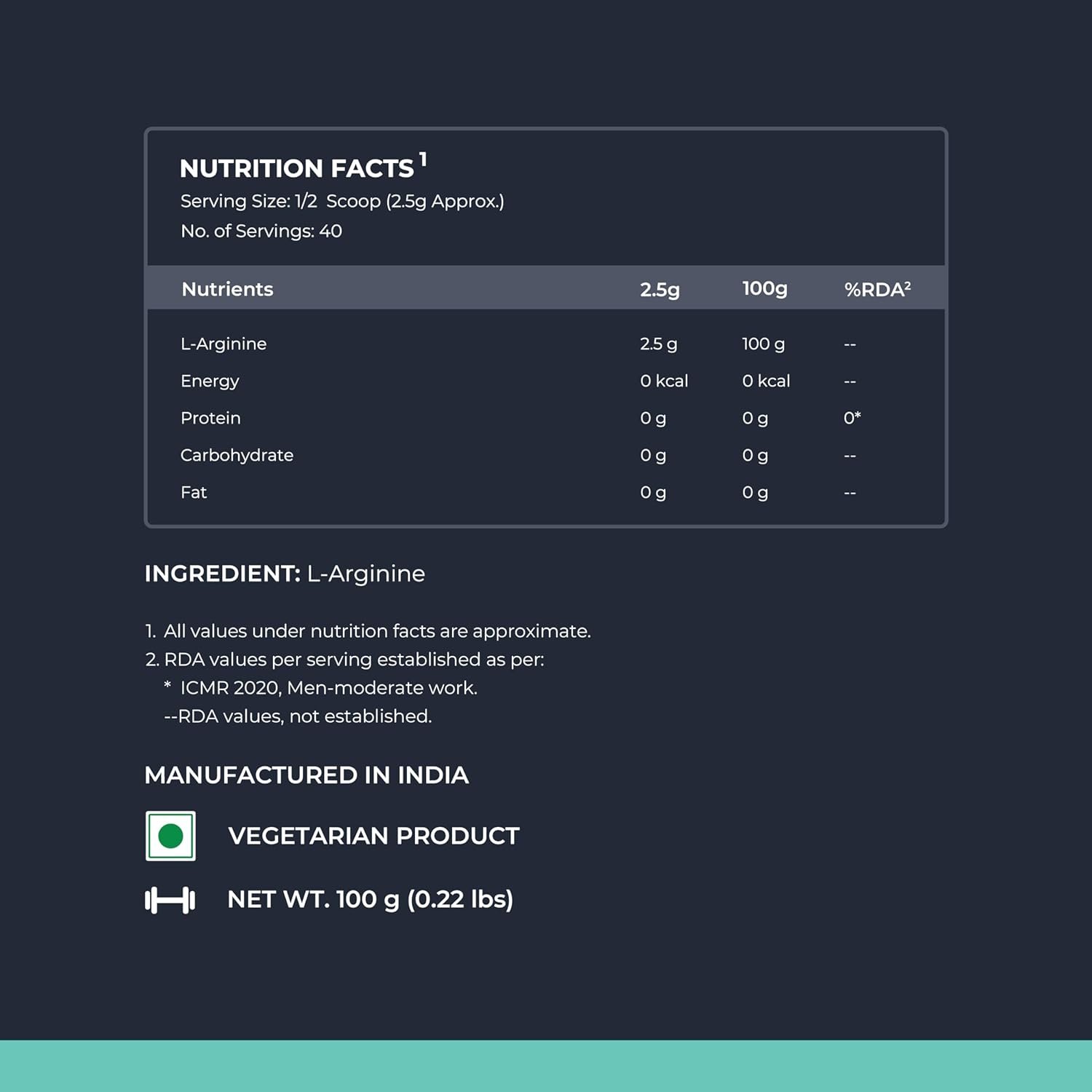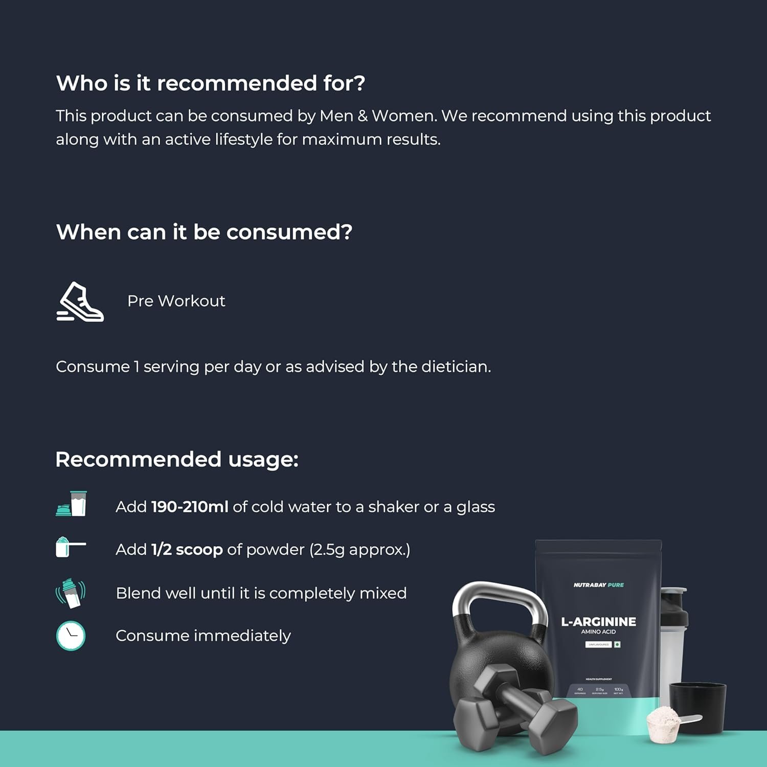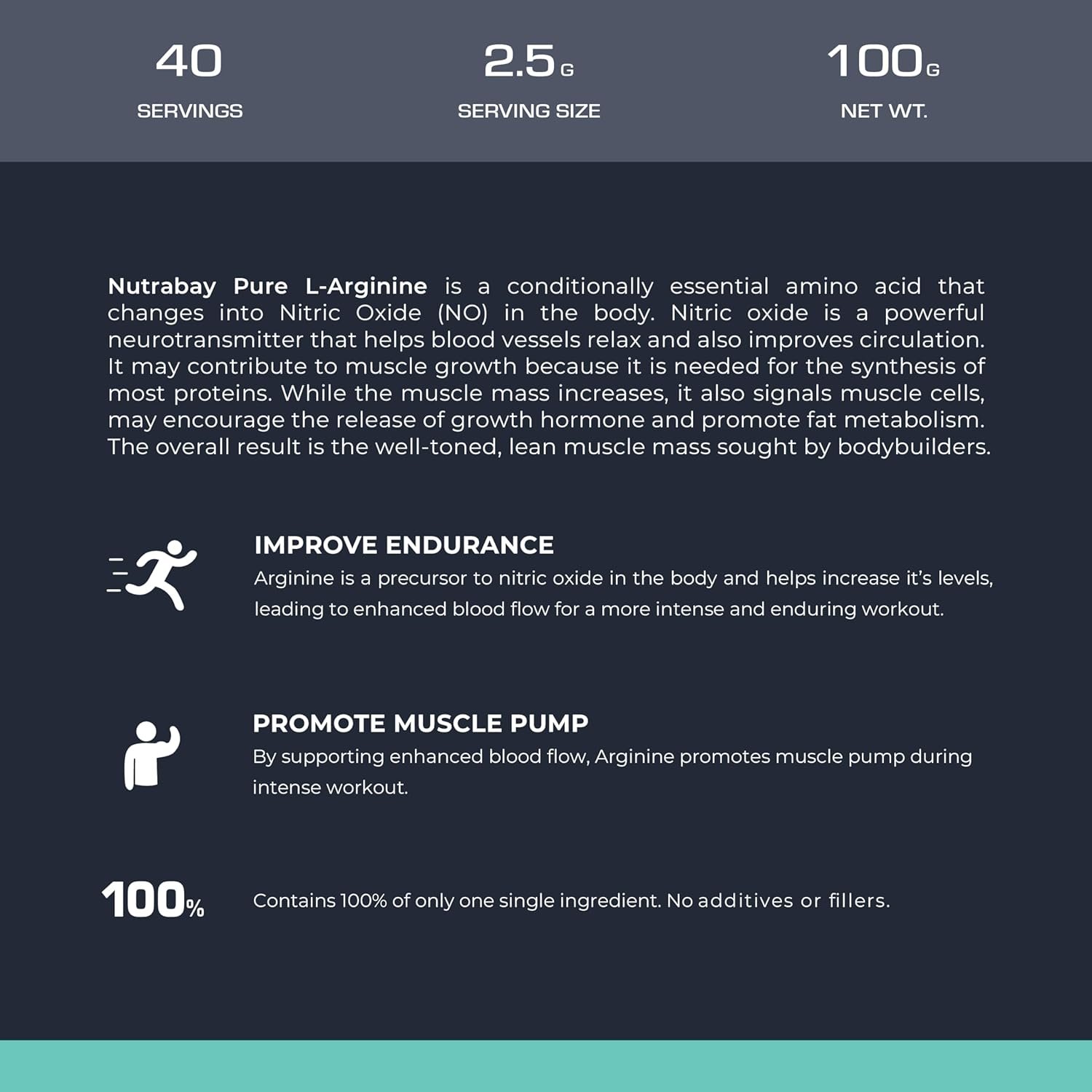 Nutrabay Pure 100% L-Arginine is an essential amino acid that helps promote healthy circulation. This means more oxygen reaches your Muscles, Brain, Heart, Lungs, and other organs. More blood flow means more muscle gains. L-Arginine also supports energy levels, which makes it perfect for weightlifters, runners, and everyday active people. It also helps maintain good blood sugar levels and provides support for a healthy immune system. Banned Substance Free : Athletes can be assured it has undergone rigorous checks and testing to ensure that it is not contaminated with any banned substances and is safe to use. Nutrabay Pure 100% L-Arginine is extracted from a vegan source. No Added sugar eliminates unnecessary calories. No added preservatives, No Artifical Colour & No Fillers ensure you get the best out of your workout supplement. Nutrabay Pure 100% L-Arginine is unflavoured in nature, which gives you the freedom to add with any other pre-workout drink to get a quick energy refill.
