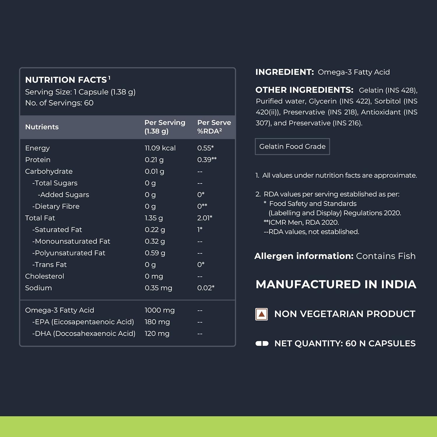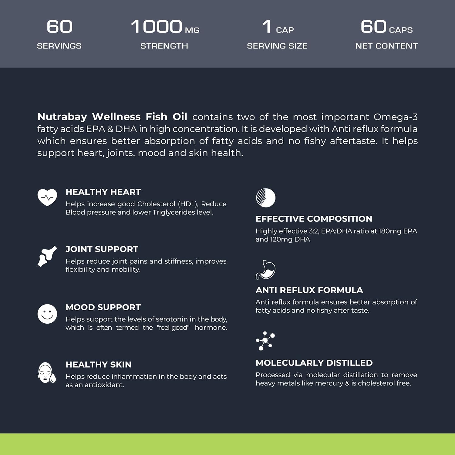 Omega 3 FISH OIL: Nutrabay Omega 3 Fish Oil is a rich source of Omega 3 Fatty Acids containing 1000 mg of Omega 3 with 180 mg of EPA & 120 mg of DHA. Supports Joint Health : Regular supplementation of Omega 3 essential fatty acids help boost blood flow during workouts, soothes tender or swollen joints, and improves joint flexibility. Omega-3 have antioxidant properties to support the immune system. Improves Heart health : Omega 3 Fish oil capsules for men and women contain essential ‘good’ fats needed for optimal heart health. EPA (Eicosapentaenoic Acid) helps reduce cholesterol levels of the body, enhancing heart health. Maintains Brain Function : Nutrabay Omega 3 Triple Strength Fish oil capsules are packed with DHA (Docosahexaenoic Acid) that helps in maintaining blood flow to the brain during important tasks and normal functioning of the brain. No Fishy Aftertaste : Nutrabay Omega 3 Fish Oil capsules are fortified with highest grade of Omega 3 that leaves no unpleasant fishy aftertaste and burps. Consume 1 capsule per day or as advised by dietician.
