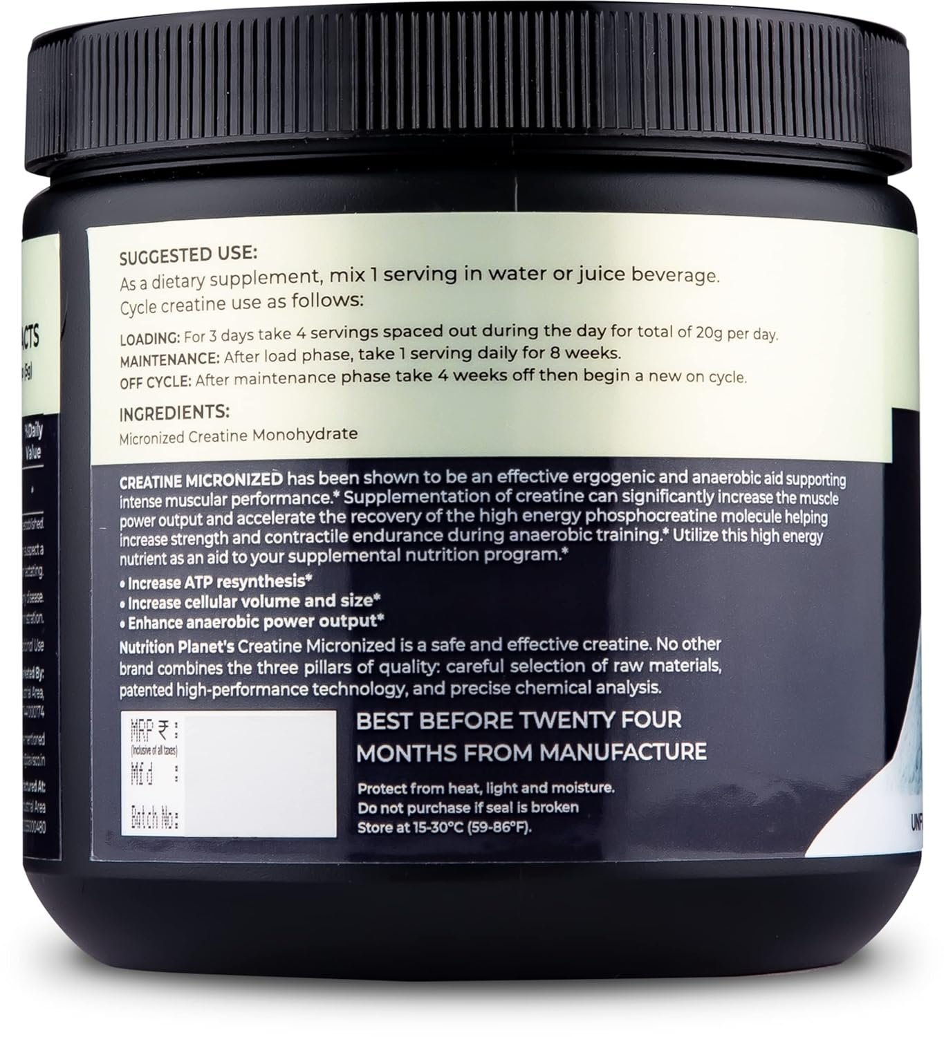 Micronized Creatine has been shown to be an effective ergogenic and anaerobic aid supporting intense muscular performance. Supplementation of creatine can significantly increase the muscle power output and accelerate the recovery of the high energy phosphocreatine molecule helping increase strength and contractile endurance during anaerobic training. Utilize this high energy nutrient as an aid to your supplemental nutrition program. Nutrition Planet's Micronized Creatine Monohydrate is safe and effective. Suggested Use: As a dietary supplement, mix 1 serving(5g) in water or juice beverage. Cycle creatine use as follows Loading: For 3 days take 4 servings (5g) spaced out during a day for a total of 20g per day. Maintenance: Following the load phase take 1 serving (5g) daily for 8 weeks. Off-Cycle: After 8 weeks on cycle, take 4 weeks off with no Creatine supplementation, then begin a new on cycle with the load cycle followed by maintenance cycle. We recommend consuming eight 12 oz. glasses of water daily while using any Creatine product. TIP: Power-up protein, meal-replacement, and weight-gainer shake with a rounded teaspoon of Micronized Creatine Powder.