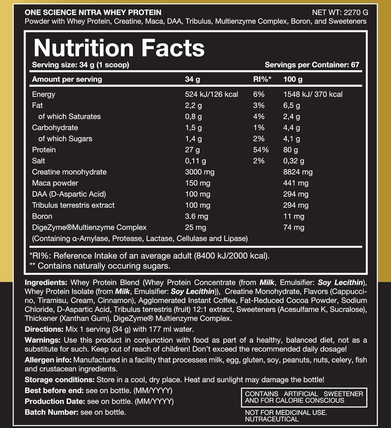 One Science Nutrition Whey Nitra is scientifically engineered to provide a ground-breaking formula that delivers fast-acting whey protein to maintain and build lean muscle. Each scoop contains 27g of quality protein that works straight on your muscles. ?Support muscle growth & maintenance ?6.6 gms BCAA per serving ?3 gms Creatine per serving ?Pure muscle-building protein ?150 mg MACA powder ?100 mg DAA ?100 mg Tribulus ?3.6 mg Boron ?With Added Digestive Enzymes & herbal testosterone boosters ?27 gms blend of whey concentrate & whey isolate ?protein source ?Delivers rich thickness and taste ?Accelerate fat metabolism ?Low in carbohydrates ?Patented & Clinically proven ingredients ?Available in 3 delectable flavors – Chocolate Brownie, Cappuccino & White Choco Almond