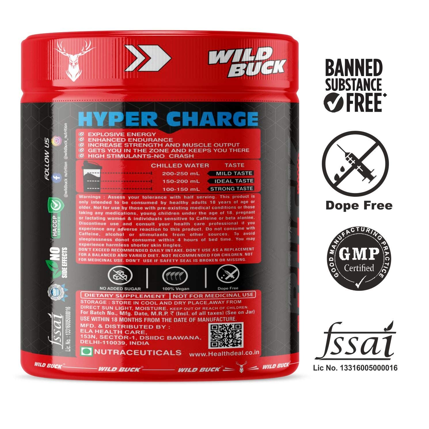 The WILD BUCK Hyper Charge X4 Pre-workout : Designed to elevate your energy, focus, power output, and performance levels, it will help you power through every training session and prime you for harder, heavier, and more productive lifts. With so many ingredients dedicated to powering up your results, The WILD BUCK Pre-workout is in a league of its own. Stop leaving gains on the table. Start making the most of your workouts today with The WILD BUCK Pre-workout, the lifting partner you’ve been looking for. Serving: For Insane Workout - Take One Scoop with 150-200ml of water and drink 10-20 minutes before action. For Hardcore Workout - Take half Scoop with 150-200ml of water and drink 10-20 minutes before action.